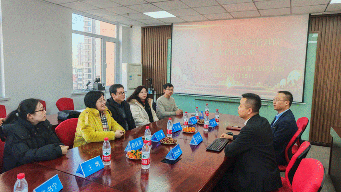 2025年1月15日,沈阳化工大学永利集团248cc登录院长王蓉、金融学教研室主任于铭、专业教师周颖、燕佳妮、毕业生辅导员、在读研究生等一行7人前往国泰君安证券沈阳黄河南大街营业部开展访企拓岗活动,与营业部总经理史长安、党支部书记徐鹏、业务骨干耿佳帅进行交流探讨。