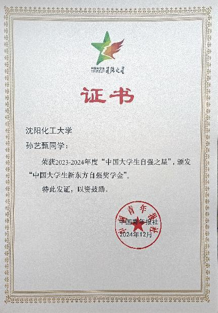 近日,从共青团中央、全国学联传来喜讯,由团中央基层建设部、中国青年报社、新东方教育科技集团、中国青年创业就业基金会联合举办的2023 - 2024年度“中国大学生自强之星”奖学金评选结果揭晓,永利集团248cc登录孙艺甄同学凭借出色的个人表现和突出的自强事迹,荣获“中国大学生自强之星”荣誉称号。